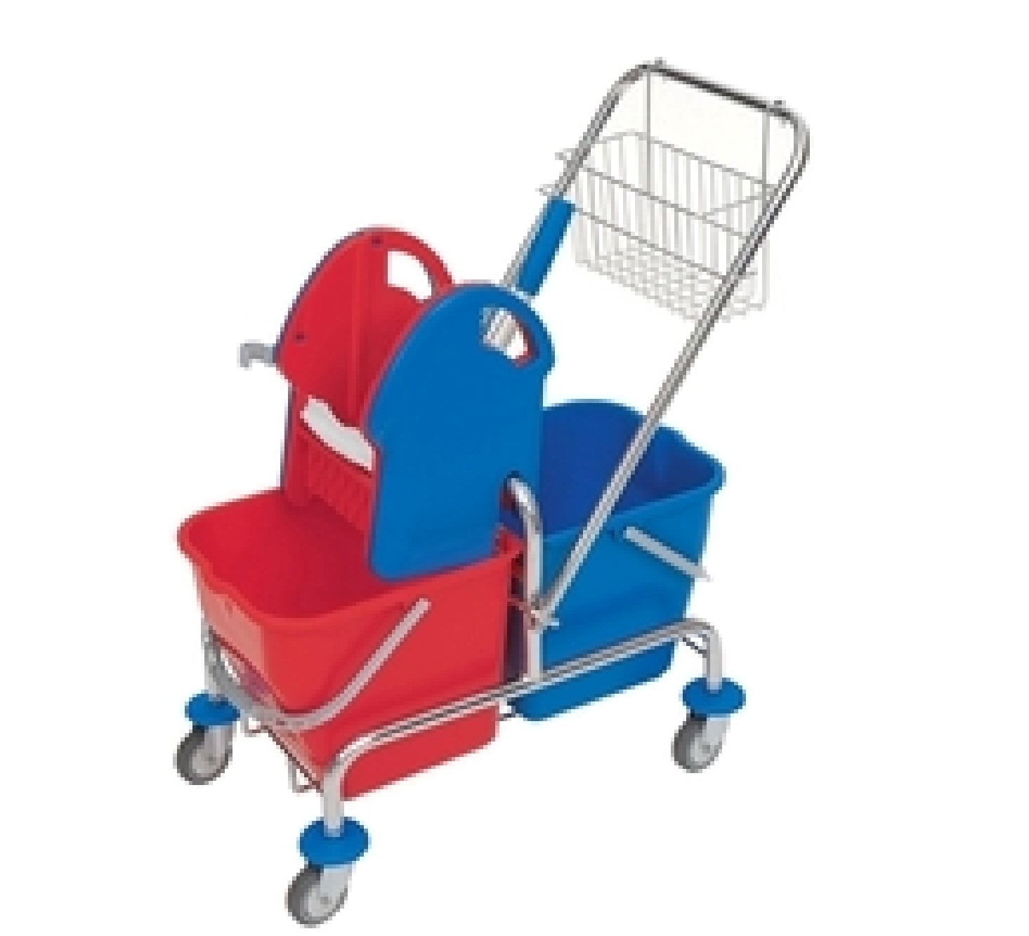 Stelaż metalowy, chromowany, na kółkach, 2 wiadra 25l, wyciskarka do mopa. Do zestawu jest dołaczony koszyk na rączkę.